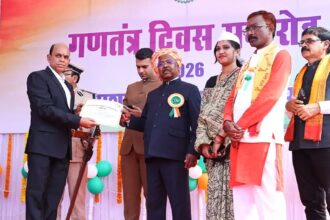 तहतक न्यूज/रायगढ़, छत्तीसगढ़। जिला स्तरीय 77वाँ गणतंत्र दिवस समारोह के अवसर पर पशु चिकित्सा के क्षेत्र में उल्लेखनीय योगदान देने वाले उप संचालक पशु चिकित्सा सेवाएँ, रायगढ़ में पदस्थ डॉ. पूरनलाल पटेल को मुख्य अतिथि कृषि मंत्री रामविचार नेताम ने प्रशस्ति पत्र प्रदान कर सम्मानित किया। डॉ. पटेल को यह…