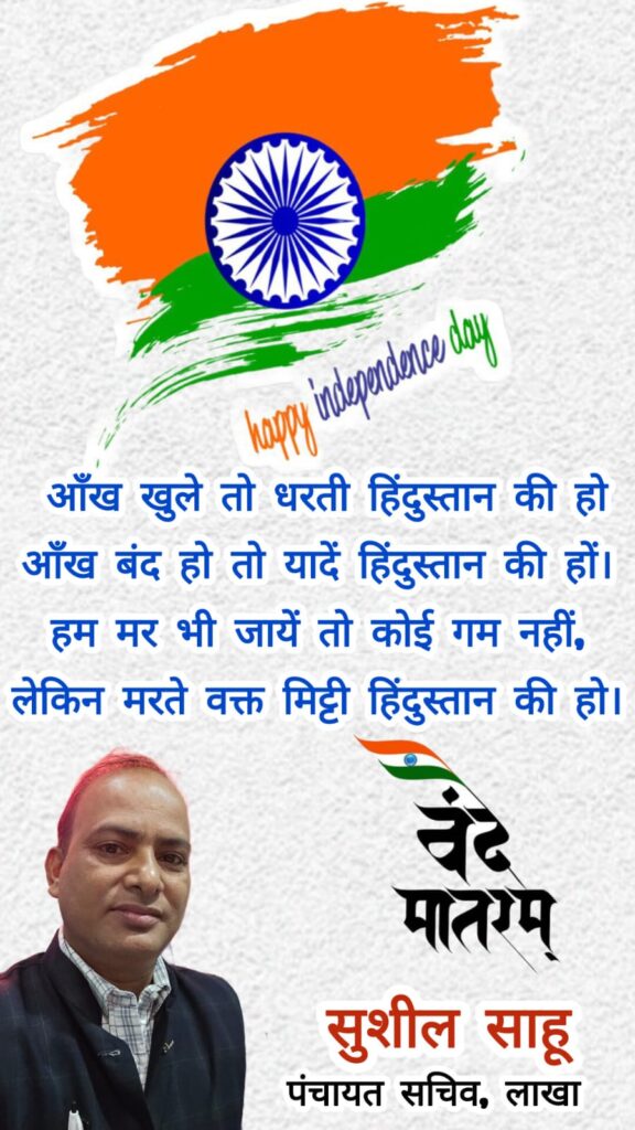 79वें स्वतंत्रता दिवस के अवसर पर सरपंच इन्द्र कुमार पंडा के नेतृत्व में समस्त ग्रामवासियों ने ग्राम लाखा के पंचायत भवन सहित आंगनबाड़ी केंद्र, स्कूल एवं समलाई मंदिर प्रांगण में भारतमाता की पूजा-अर्चना कर देश की आजादी का प्रतीक तिरंगा ध्वजारोहण कर सलामी देते हुए बड़े ही उत्साह से राष्ट्रीय पर्व मनाया।
