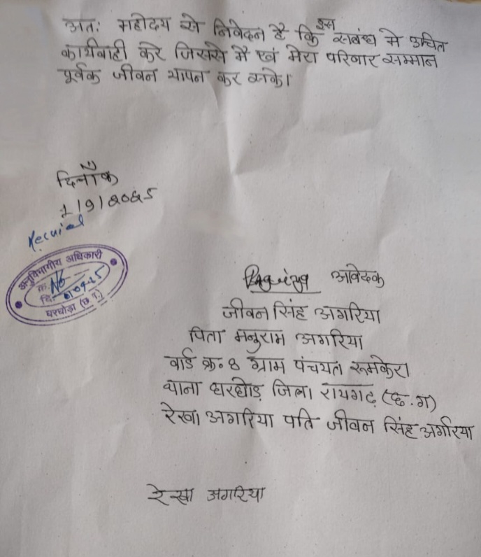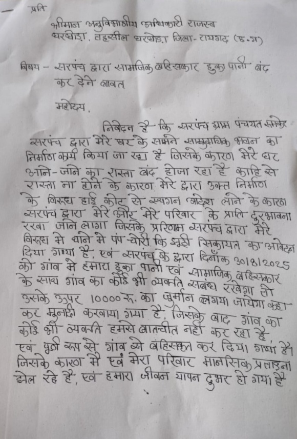 सामाजिक बहिष्कार का दंश झेल रहे पीड़ित परिवार द्वारा एसडीएम को दिए गए ज्ञापन में उल्लेख किया गया है कि सरपंच ग्राम पंचायत रूमकेरा सरपंच द्वारा मेरे घर के सामने सामुदायिक भवन का निर्माण कार्य किया जा रहा है जिसके कारण मेरे घर आने-जाने का रास्ता बंद हो जा रहा है। कहीं से रास्ता ना होने के कारण मेरे द्वारा उक्त निर्माण के विरुद्ध हाई कोट से स्थगन आदेश लाने के कारण सरपंच द्वारा मेरे और मेरे परिवार के प्रति दुर्भावना रखा जाने लगा जिसके परिणाम स्वरुप सरपंच द्वारा मेरे खिलाफ थाने में पंप चोरी की झूठी शिकायत का आवेदन दिया गया है एवं सरपंच के द्वारा दिनांक 30/8/2025 को गांव में हमारा हुक्का-पानी बंद एवं सामाजिक बहिष्कार के साथ गांव का कोई भी व्यक्ति सबंध रखेगा तो उसके ऊपर 10000 रु. का जुर्माना लगाया जायेगा कहकर मुनादी करवाया गया है, जिसके बाद गांव का कोई भी आदमी हमसे बातचीत नहीं कर रहा है, एवं पूर्ण रूप से हमें गांव से बहिष्क्रित कर दिया गया है। जिसके कारण मैं एवं मेरा परिवार मानसिक प्रताड़ना झेल रहे है, एवं हमारा जीवन यापन दूभर हो गया है। अतः महोदय से निवेदन है कि सबंध में उचित कार्यवाही करे जिससे में एवं मेरा परिवार सम्मान पूर्वक जीवन यापन कर सकें।