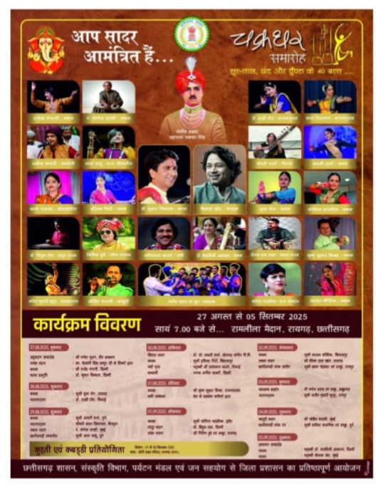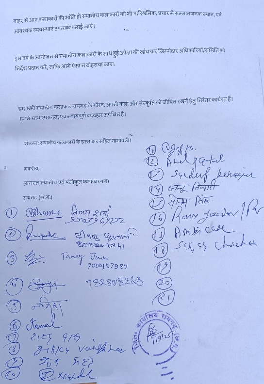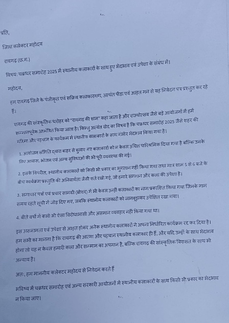 पिछले कुछ अरसे से विवादों में रहने वाला रायगढ़ का प्रसिद्ध चक्रधर समारोह इस बार भी सवालों के कटघरे में नजर आ रहा है। चक्रधर समारोह 2025 में स्थानीय कलाकारों के साथ भेदभाव और उपेक्षा किए जाने के गंभीर आरोप लगे हैं, जिसको लेकर रायगढ़ के पंजीकृत कलाकारों ने विरोध प्रकट करते हुए सामूहिक रूप से कलेक्टर को ज्ञापन सौंपा है।