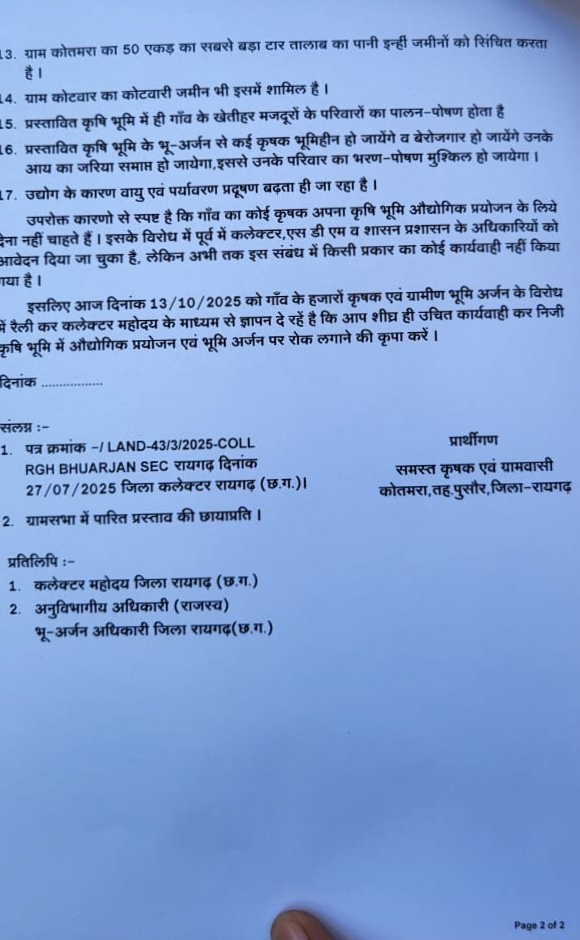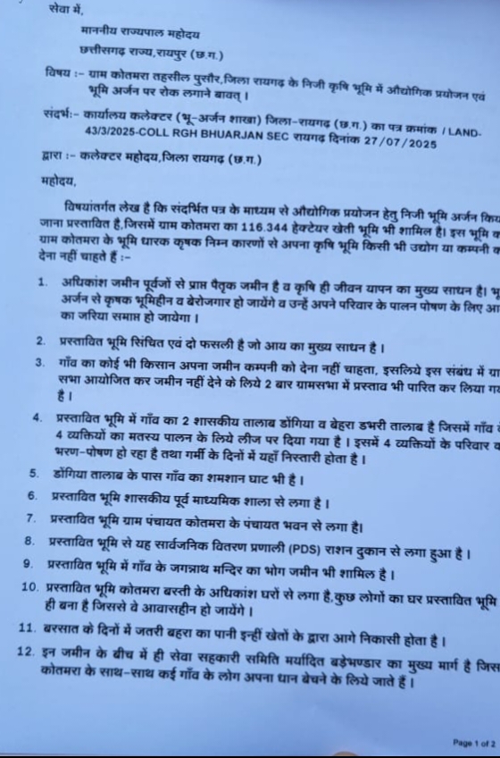 उल्लेखनीय है कि इस भू-अर्जन में ग्राम कोतमरा का 116.344 हेक्टेयर खेती भूमि भी शामिल है। इस भूमि को ग्राम कोतमरा के भूमि धारक कृषक किसी भी उद्योग या कम्पनी को देना नहीं चाहते हैं। ग्रामीणों की मांग है कि अधिकांश जमीन पूर्वजों से प्राप्त पैतृक जमीन व कृषि ही जीवन यापन का मुख्य आधार है। भू-अर्जन से कृषक भूमिहीन व बेरोजगार हो जायंगे और उनका अपने परिवार के पालन पोषण के लिए आय का जरिया समाप्त हो जायेगा। प्रस्तावित भूमि सिंचित एवं दो फसली है जो आय का मुख्य साधन है। गांव का कोई भी किसान अपना जमीन कम्पनी को देना नहीं चाहता, इसलिये इस संबंध में ग्राम सभा आयोजित कर जमीन नहीं देने के लिये 2 बार ग्रामसभा में प्रस्ताव भी पारित कर लिया गया है।