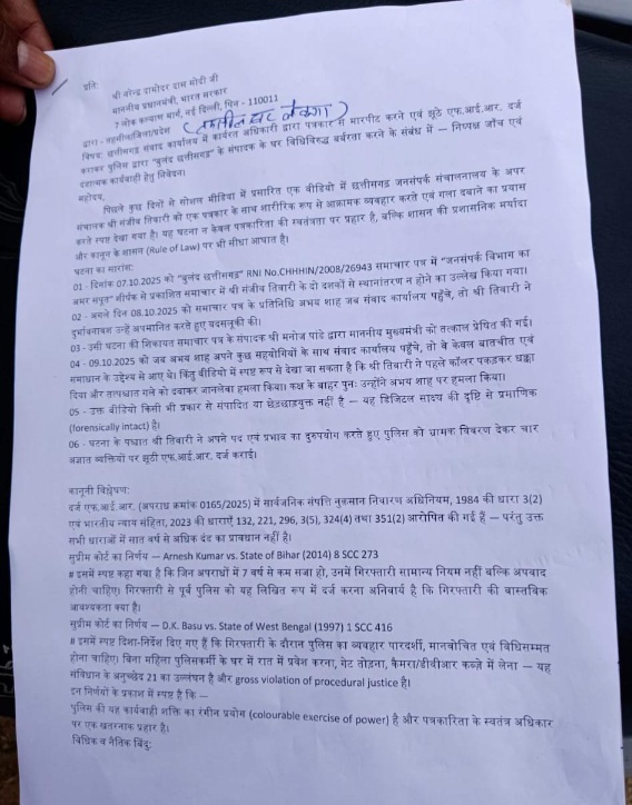 छत्तीसगढ़ में पत्रकारों के साथ दुर्व्यवहार, उत्पीड़न और सत्ता संरक्षण में प्रशासनिक मनमानी के आरोप की तस्वीर एक बार फिर सुर्खियों में हैं। इस बार राज्य के जनसंपर्क संचालनालय के एक वरिष्ठ अधिकारी पर पत्रकार से मारपीट करने और बाद में झूठी एफआईआर दर्ज कराने का गंभीर आरोप लगा है।