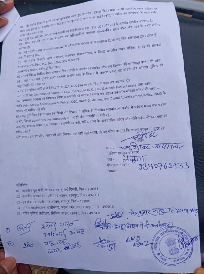 घटना के बाद श्री तिवारी ने अपने पद का दुरुपयोग करते हुए पुलिस से मिलकर चार अज्ञात लोगों पर झूठी एफआईआर दर्ज कराई। पुलिस ने देर रात 1:37 बजे “बुलंद छत्तीसगढ़” के संपादक मनोज पांडे के घर में बिना अनुमति प्रवेश किया, गेट तोड़ा और महिला पुलिसकर्मी की अनुपस्थिति में तलाशी ली।