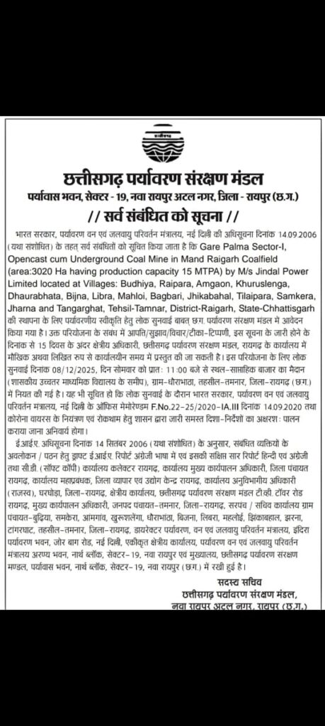 जिले में जनसुनवाईयों के विरोध की चिंगारी अभी ठीक से बुझ नहीं पायी है और अब उसे फिर से हवा मिलनी शुरू हो गयी है। छत्तीसगढ़ पर्यावरण संरक्षण मण्डल ने कोयला खदान गारे-पेलमा सेक्टर-1 की स्थापना के लिए पर्यावरणीय स्वीकृति हेतु आगामी दिनाँक 08/12/2025 को जनसुनवाई तमनार के धौराभाठा में निश्चित किये जाने की सूचना जारी की है, जिससे लोगों के माथे पर बल पड़ने लगे हैं और भवें टेढ़ी होने लगी हैं।